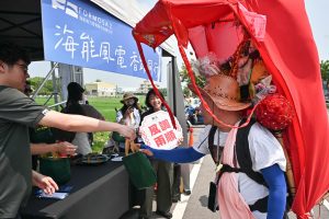 在進香活動期間,海能風電現場志工一早便備妥補給物資,隨著進香隊伍經過,逐一將祈福大禮包親手遞送給徒步信眾。大禮包內含涼感濕紙巾、扇子與提袋等實用物資,協助長時間步行的民眾即時補充所需、舒緩疲勞。補給點前人潮絡繹不絕,不少信眾在接過物資時與海能志工互道平安、加油打氣,使整個互動過程充滿人與人之間溫暖的「結緣」與對「風調雨順」的共同期許。